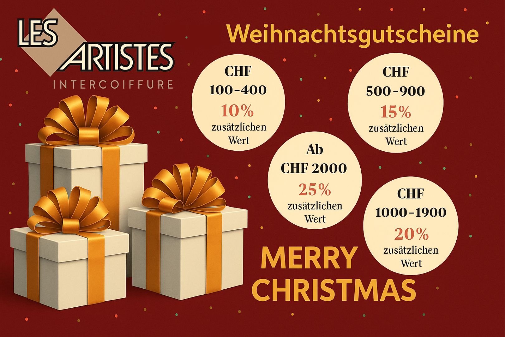 Die Adventszeit ist da – diese magische Zeit im Jahr, in der es nach Guetzli, Punsch und Glühwein duftet. Lichter funkeln überall und wir möchten unseren Liebsten eine Freude bereiten. Darum haben wir dieses Jahr etwas Besonderes vorbereitet: unsere Weihnachts-Gutscheinaktion!